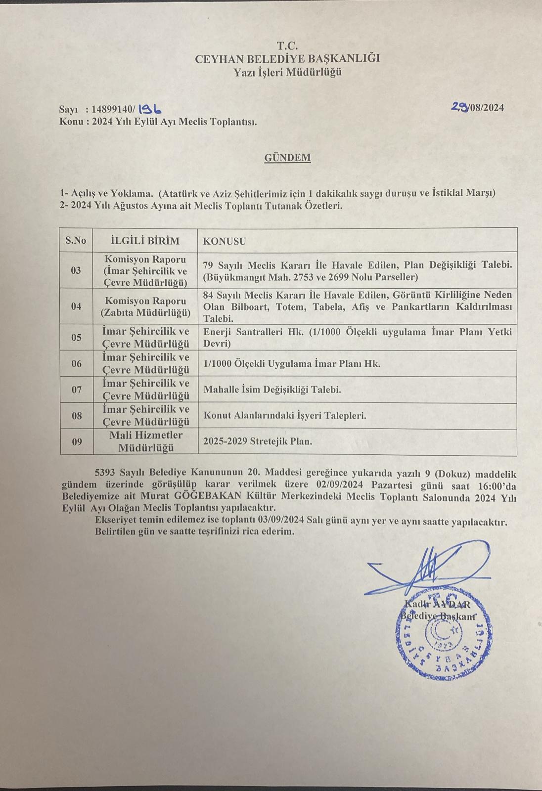 2024 EYLÜL AYI OLAĞAN MECLİS GÜNDEMİ